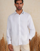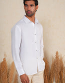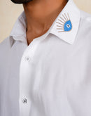 A soft white cotton shirt with subtle blue collar detailing, offering reliable comfort and style. Perfect for both casual and semi-formal wear. Versatile and easy to pair