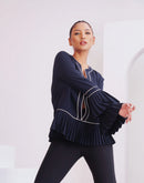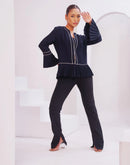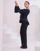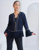Introducing the Elegance Top, a stunning piece designed to elevate your wardrobe. This classic top features a beautiful flair at the bottom and refined piping details along the front and sleeves. Crafted from high-quality fabric, the Elegance Top offers both comfort and style, making it perfect for both formal and casual occasions. The pleated bell sleeves add a touch of sophistication, ensuring you stand out with grace and poise. Pair it with your favorite pants or skirt for a polished and chic look.