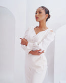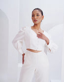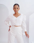 A sophisticated top crafted from luxurious fabric, featuring exquisite tailoring and unique design elements. This top is available in two classic colors: black and white, ensuring versatility and elegance for any wardrobe. The structured silhouette and thoughtful details make it a standout piece. Whether dressing up for an event or adding a touch of refinement to your everyday look, this top is a perfect choice for those who appreciate the finer things in fashion.8