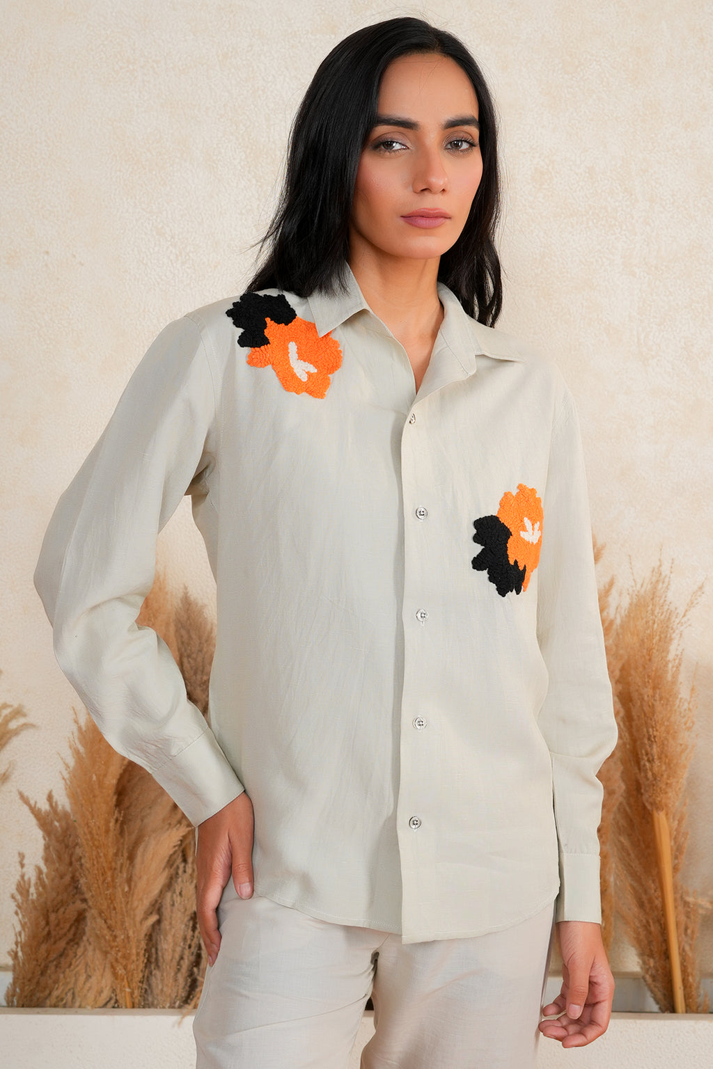 A stone-colored linen shirt with vibrant floral patches, offering reliable comfort and style. Perfect for casual outings or relaxed gatherings. A subtle burst of color with a grounded, versatile look.
