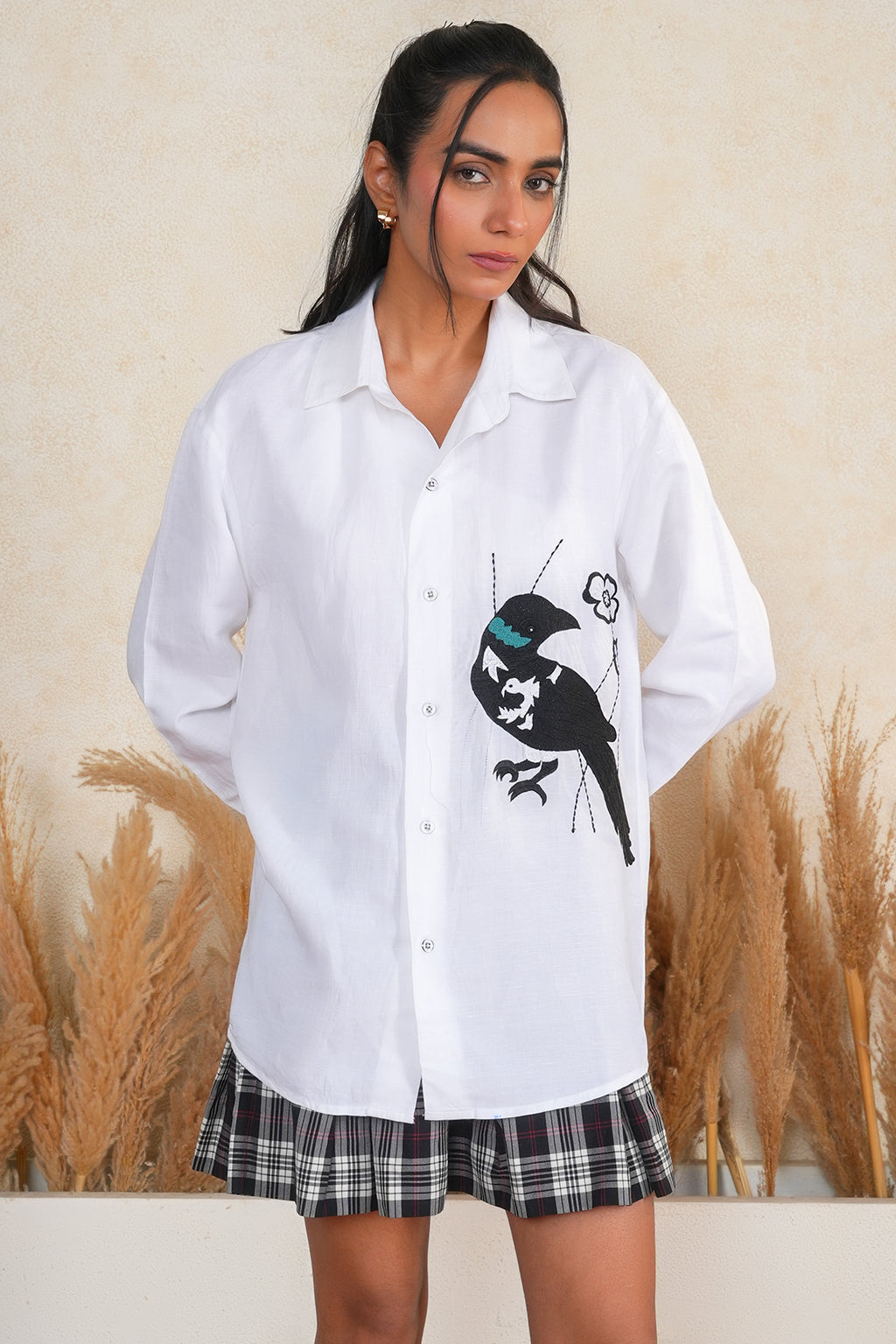 A comfy oversized white cotton shirt with bold bird embroidery. Ideal for casual outings or work, blending style with reliable comfort.
