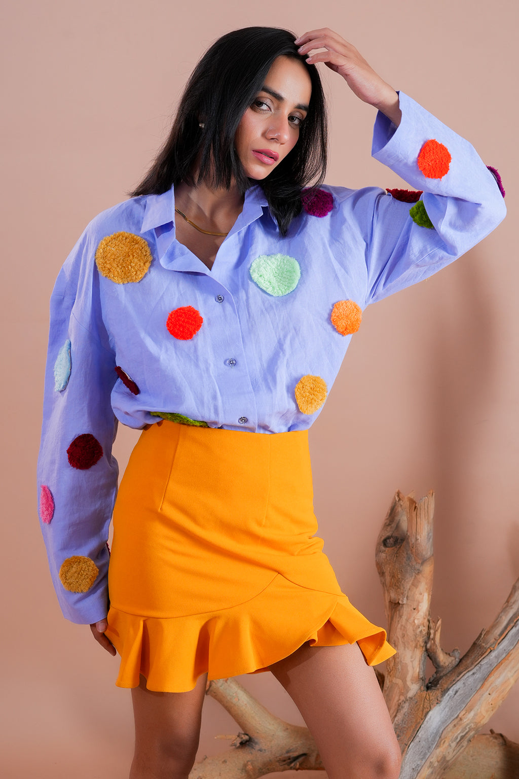 The Bloom Shirt, made from soft cotton, features a lavender base with colorful polka dots. Perfect for casual outings or lively parties, it offers both comfort and flair