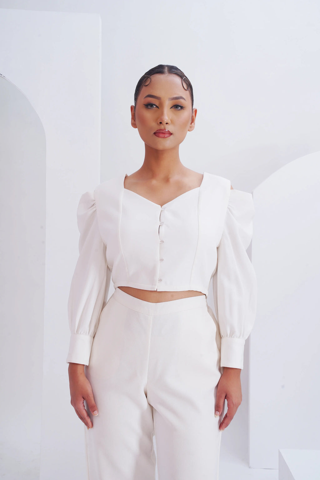 A sophisticated top crafted from luxurious fabric, featuring exquisite tailoring and unique design elements. This top is available in two classic colors: black and white, ensuring versatility and elegance for any wardrobe. The ...